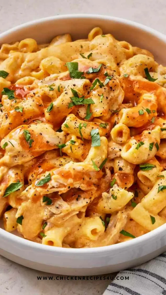 I first tried a version of this at a ballpark and I loved it so much I recreated it at home. The idea is simple and brilliant. Cooked pasta is folded into a smooth cheese sauce that has cheddar and Monterey Jack for creaminess. Buffalo hot sauce wakes everything up and crumbled blue cheese adds tangy bites. Tender pieces of rotisserie chicken finish the dish so every forkful has protein and spicy flavor.
