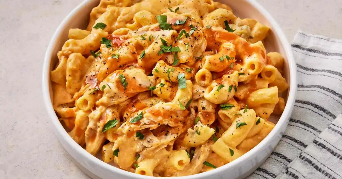 I first tried a version of this at a ballpark and I loved it so much I recreated it at home. The idea is simple and brilliant. Cooked pasta is folded into a smooth cheese sauce that has cheddar and Monterey Jack for creaminess. Buffalo hot sauce wakes everything up and crumbled blue cheese adds tangy bites. Tender pieces of rotisserie chicken finish the dish so every forkful has protein and spicy flavor.