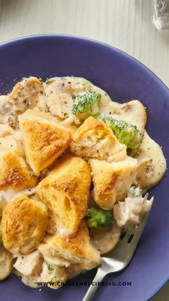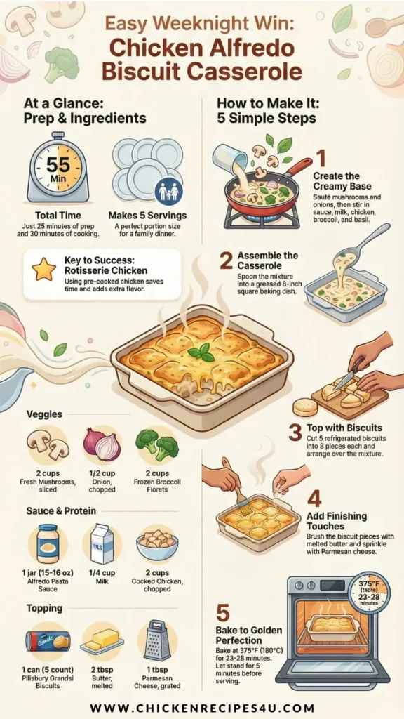 I still remember the first time I made this casserole at home. The combination of creamy Alfredo sauce, tender chicken, and soft, golden biscuits on top felt like the ultimate comfort food.