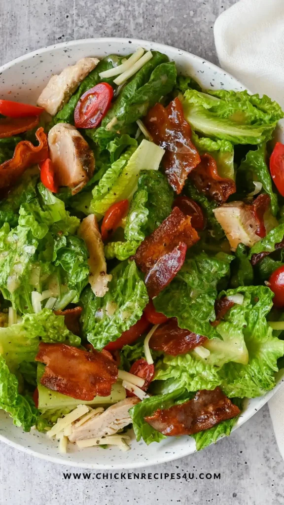 This version adds chicken and cheese to make the salad feel more like a meal. The lettuce gives a cool crunch, the bacon adds a warm smoky taste, and the tomatoes bring juicy bites that brighten everything. The simple vinaigrette coat the pieces so each bite feels balanced and full of flavor.