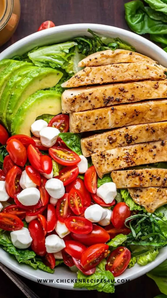 This recipe is special because it keeps everything simple. You get juicy chicken cooked in a sweet and tangy marinade, soft mozzarella balls, sweet tomatoes, creamy avocado, and crisp lettuce all in one bowl. The dressing works both as a marinade and as a topping, which makes the whole thing extra easy.