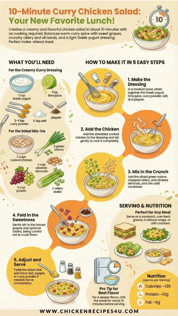 This chicken salad mixes creamy yogurt with warm spices and fresh add ins for a bright and tasty meal. Here’s how it all comes together: