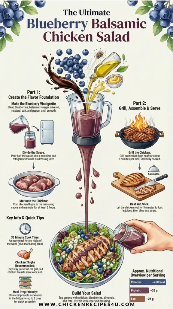 This recipe is all about balance. The chicken is savory and grilled until juicy, the blueberries add gentle sweetness, and the balsamic vinegar brings everything together with a tangy kick.