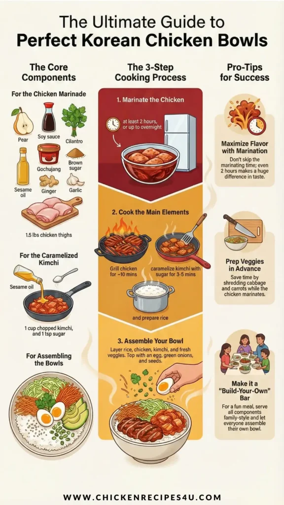 I’m so happy to share this Korean Chicken Bowls recipe because it is packed with bold flavor but still very easy to make at home. The chicken turns out juicy and full of sweet and savory taste from a simple marinade, then it gets grilled until lightly charred. Everything is served over rice and topped with fresh veggies and warm caramelized kimchi. It is filling, comforting, and perfect for a fun dinner bowl night.