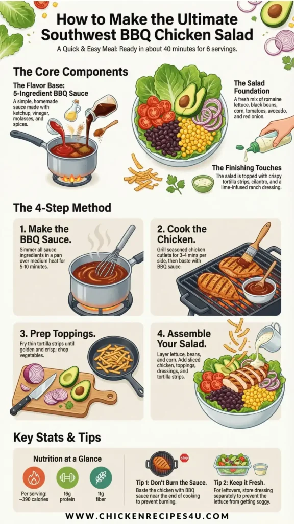 This Southwest BBQ Chicken Salad is fresh, colorful, and packed with flavor. The combination of BBQ-glazed chicken, crisp vegetables, creamy avocado, and tangy ranch makes it a meal that is both satisfying and fun to eat.