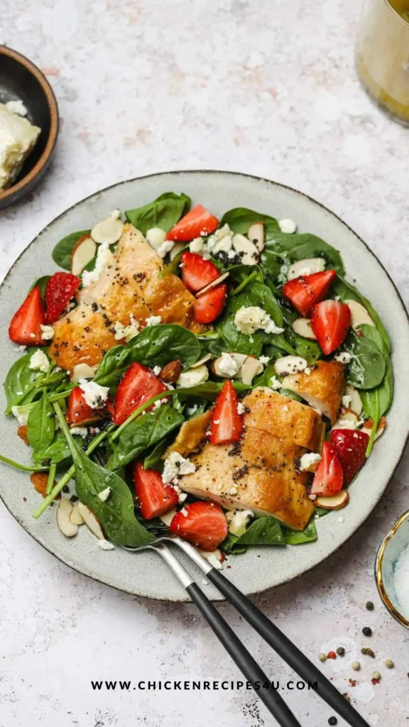 I make this salad whenever I want something light but filling. The dressing is simple balsamic vinaigrette that also doubles as a marinade for the chicken. That means the chicken soaks up flavor and the salad stays bright. The mix of sweet strawberries, rich avocado, salty feta, and crunchy almonds gives different textures in every bite. You can grill the chicken outside or cook it on a stovetop grill pan. I like to cook a few breasts ahead on the weekend so I can toss this together in minutes during the week.