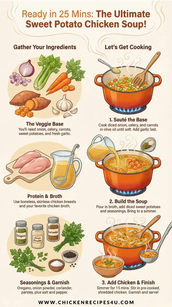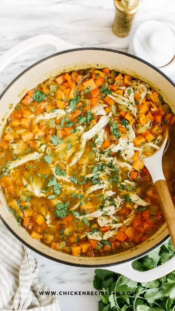 This soup is simple but full of flavor. Juicy chicken, sweet potatoes, and soft vegetables cook in a gentle broth with easy seasonings. It is warm, satisfying, and great for lunch, dinner, or meal prep during the week.