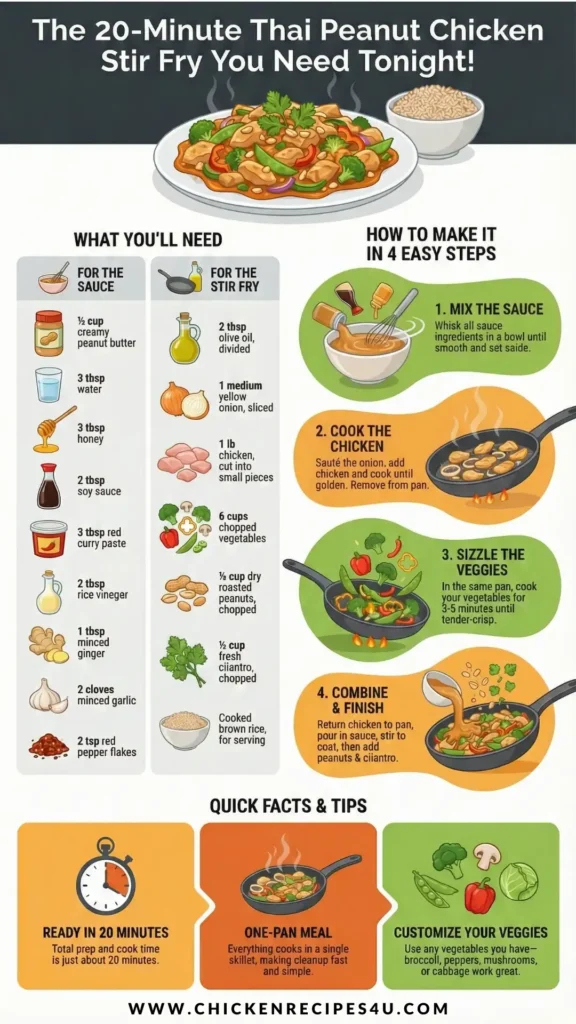 This Thai Peanut Chicken Stir Fry is creamy, bold, and full of comforting flavor. It comes together quickly, uses simple ingredients, and delivers a satisfying mix of tender chicken, fresh vegetables, and rich sauce.